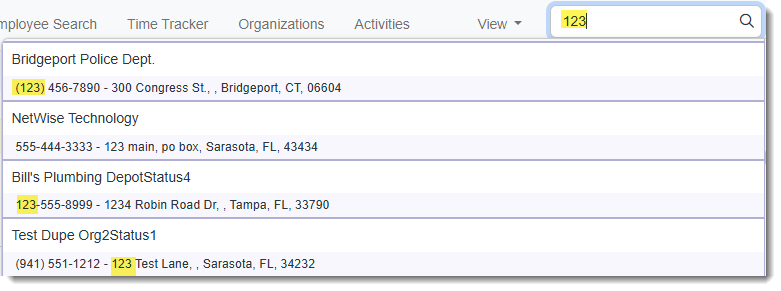 Special characters are allowed but are ignored. For instance, in the example below, (123) has been entered but since the system is searching for the numbers "123" and ignoring the parentheses, the results include phone numbers that contain the parentheses in the area code as well as other occurrences of "123":
