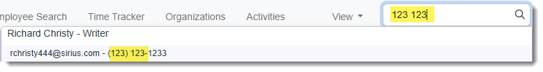 Special Note Regarding Spaces: While special characters, such as parentheses and hyphens or dashes are ignored, you must include any spaces that are part of the saved value. In the example below, we are attempting to locate a record with a phone number beginning in (123) 123. We do not need to enter the parentheses but we must enter the space after the Area Code as leaving it out causes no results to be found: