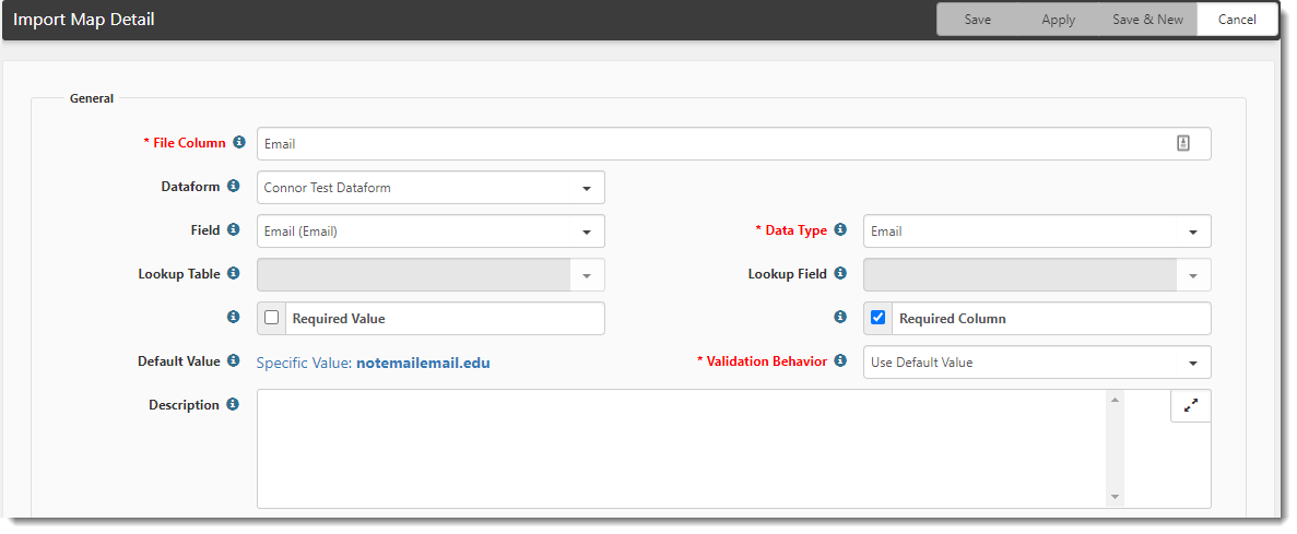 Note: If you click the Required Value checkbox on the Import Map Detail screen and the selected Data Type is "Email", "Fail Entire Row" is set by default in the Validation Behavior field and cannot be edited (unless you uncheck Required Value). This informs the system that an email field entry is required in each import row. If the email value is missing (i.e., blank) in the import row, the row fails. No Default Value substitutions are permitted. |