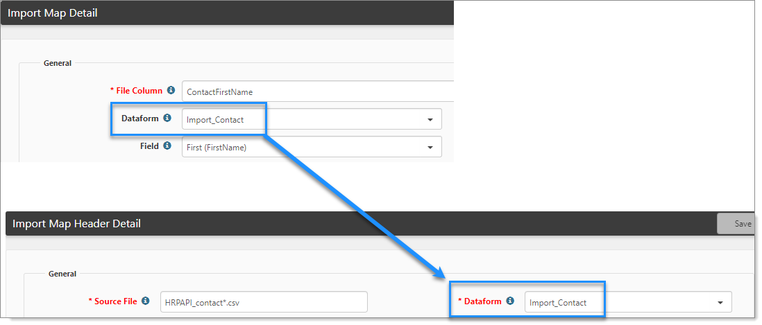 Tabbed dataforms always have a parent form field linked to the primary dataform selected on the Import Map Header Detail and are associated with the primary form as a tab. For information about associating tabbed forms, log an Extranet case. |