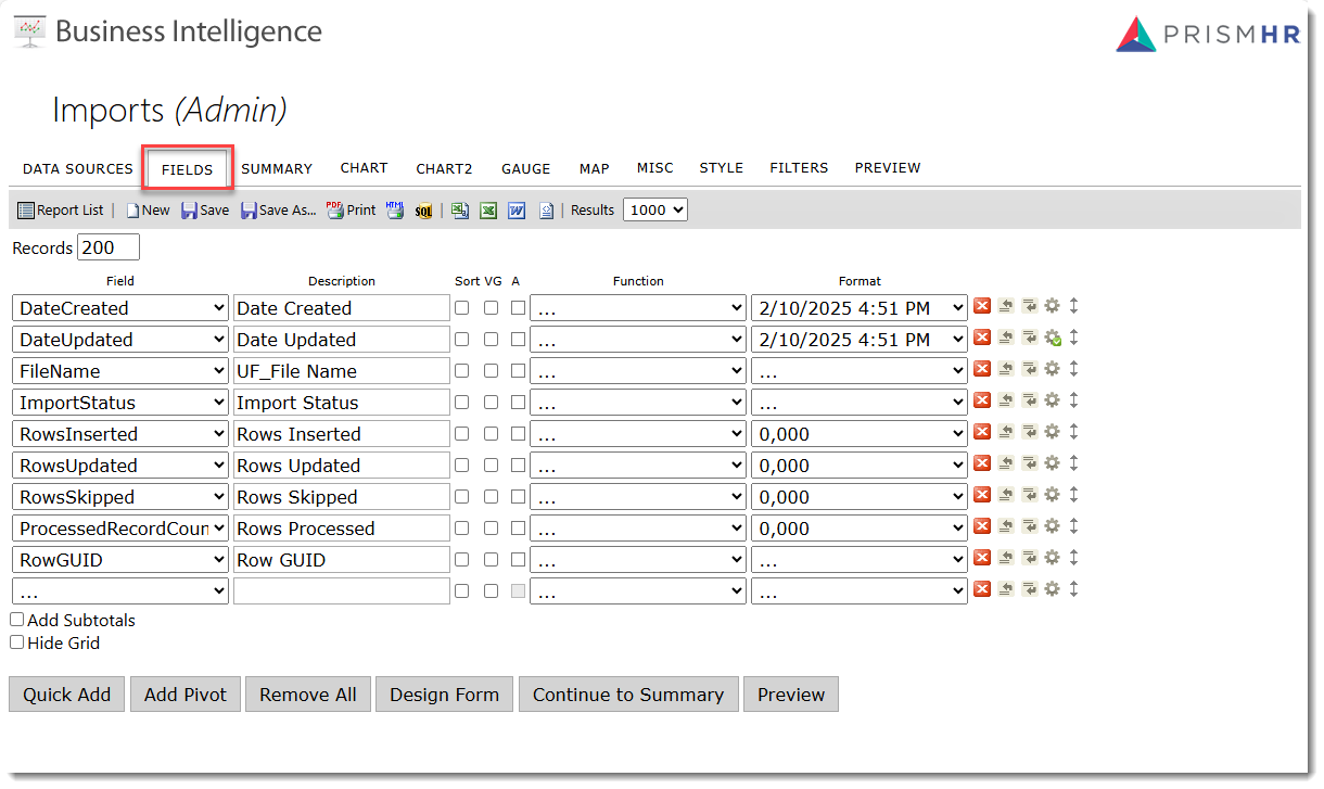 The Imports report is configured with the following default fields and field formats on the Fields tab..