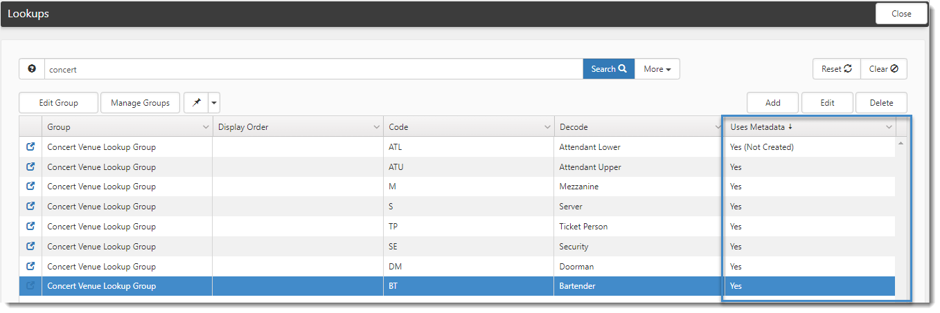 The Uses Metadata column on the Lookups dashboard shows whether a lookup has a metadata dataform associated with its lookup group and whether associated metadata has been configured for a specific lookup value: