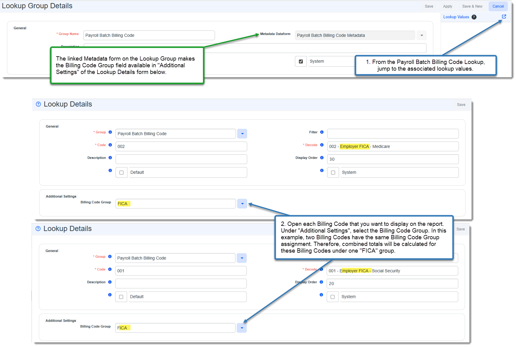 > Lookups) together with Billing Code Group metadata. Assigning the Billing Group serves two purposes in this instance. It allows you to group related billing codes together so that report totals are correct. An example of this is shown below where Billing Code 001 = Employer FICA - Social Security and Billing Code 002 = Employer FICA - Medicare are both added to the FICA Billing Group.