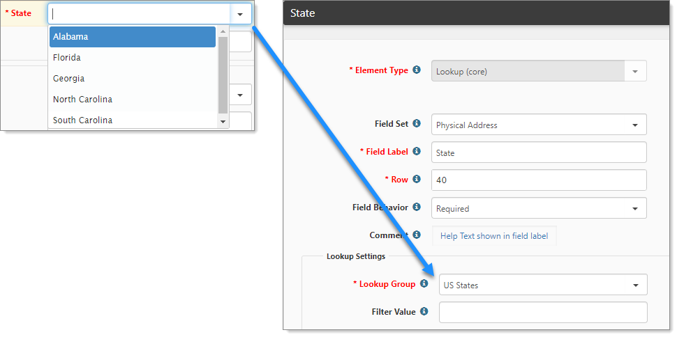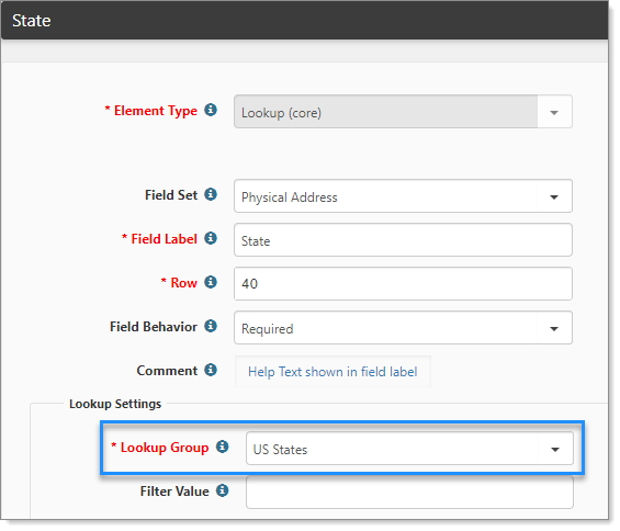 The form configuration opens for the selected field. Our example shows we selected the field State. - In Lookup Group, select the group.