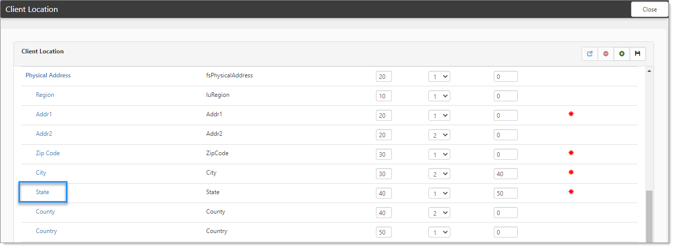 After the group and values are defined, the next step is to connect a field that uses lookups to the new group. The following procedure and subsequent topics use the dataform Client Location and the field State. The State field uses a lookup group US States. This topic guides you through configuring a dataform field to use a lookup.