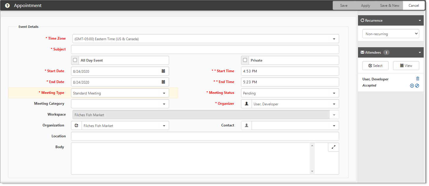 - The Appointment form is where you create the new calendar event. The example and following list guide you through the form.