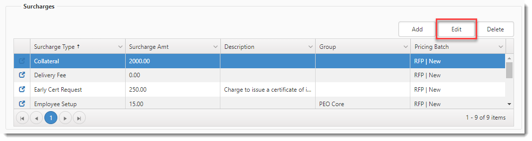 From the Pricing Console, in the Surcharges area, select a surcharge record and click Edit OR click