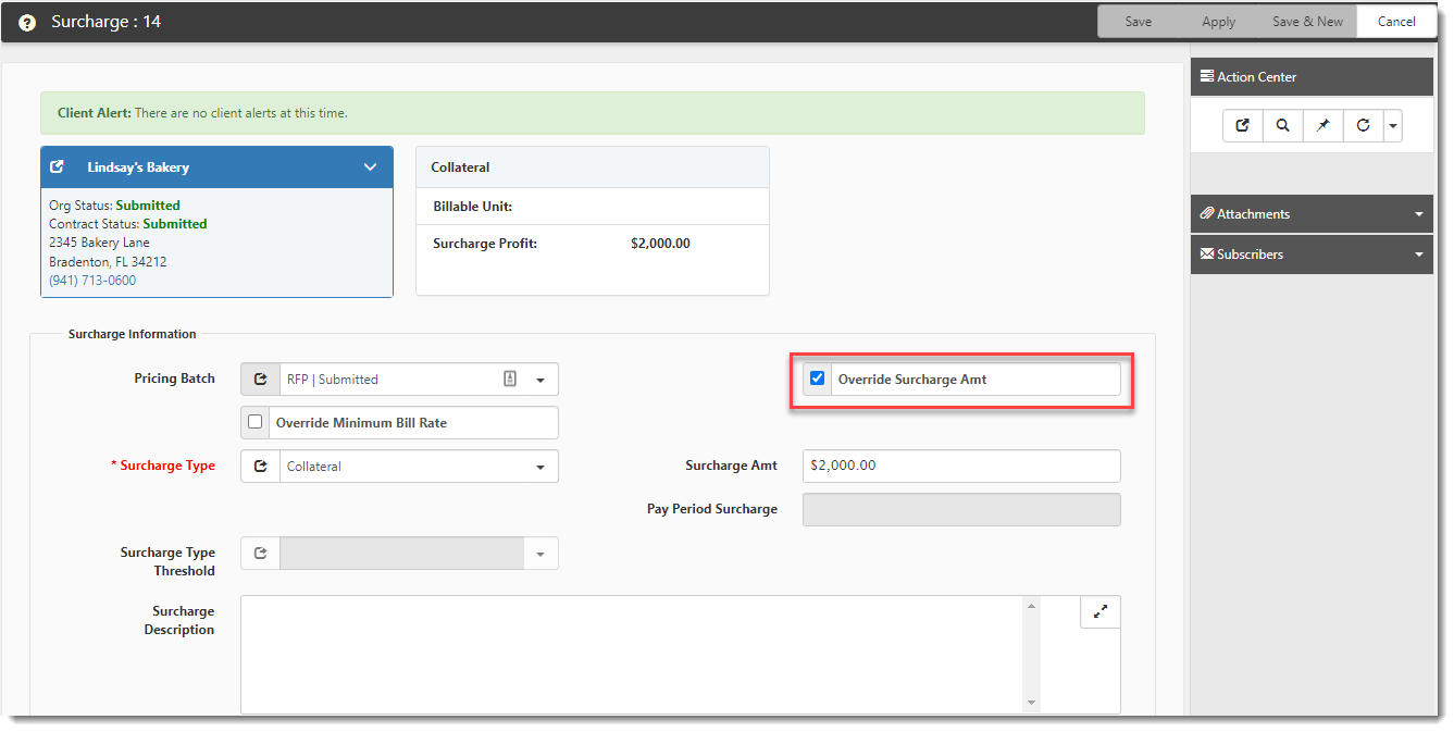 Surcharge Amt - Requires user to click Override Surcharge Amt checkbox to access the field.