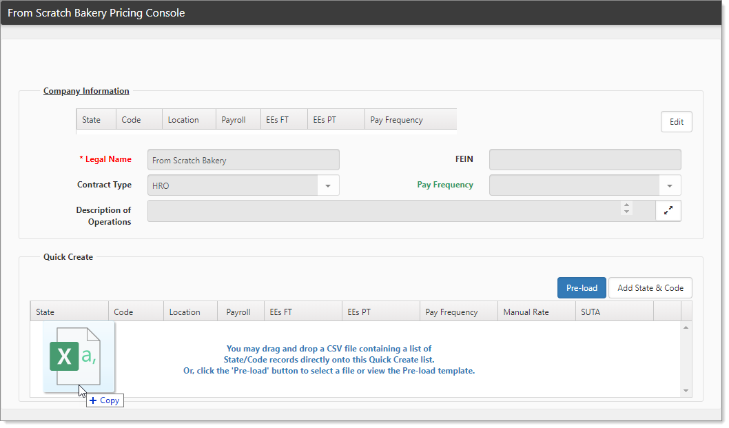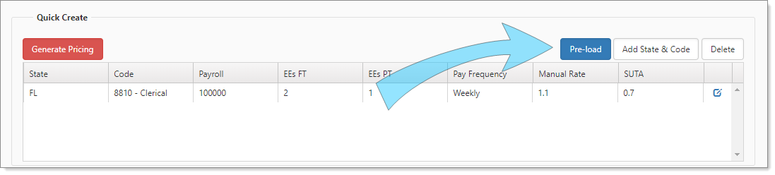 The bulk approach involves editing a preformatted file (quick_create_preload_template.csv) to reflect States, Codes, Pay Frequency, Wages, and Employee counts. The file is available in the Help system (Quick Create Template) and through the Pricing Console. Next, you upload the edited file and then generate pricing. Additionally, when changes occur, you can edit the data and upload the file again. See Re-uploading pricing data.