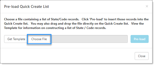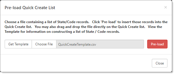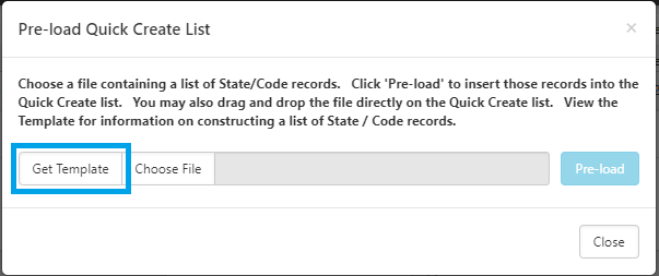 If the Get Template option is not available, your administrator must upload the template file on the Admin Workspace PEO Configuration page in the Quick Create Pre-load Template field. For help with this, create an Extranet case.
