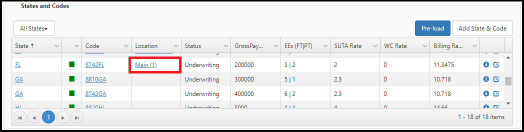 Note: The Pricing Code Location field is inactive by default. The field only displays if active on the Pricing Comp Code form. If the Pricing Code Location field is active, you must select a value in the Comp Code field before you can select a value in the Pricing Code Location field. You can edit a location by selecting the location in the States and Codes area of the Pricing Console.