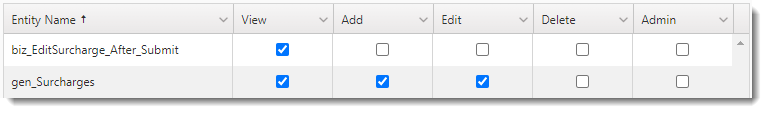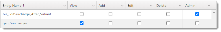 In the example below, the gen_Surcharges entity allows View, Add, and Edit rights to the Surcharges form and the biz_EditSurcharge_After_Submit entity is set to View access. A user in a role with entities configured as shown has access to edit surcharge pricing fields after pricing is submitted (assuming that there are no field-level security restrictions in place on any of the surcharge pricing fields):