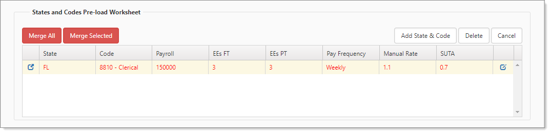 You are returned to the Pricing Console. The newly uploaded row appears in a different grid, States and Codes Pre-load Worksheet, for reviewing the data, potentially correcting and re-uploading, and merging when ready. In our example, we have an entry with red text and yellow background, which indicates the data already exists, and we need to determine if a merge is a correct action.