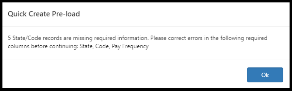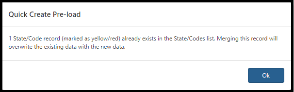 Note: If you click Cancel to fix the errors or problems with the data in the CSV file, the system clears the values cached in the State and Codes Pre-load Worksheet. After fixing issues with the data in the CSV file, you can try to re-upload the data again and then proceed with the merge steps.