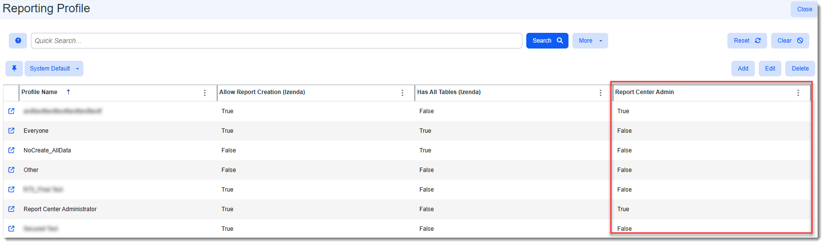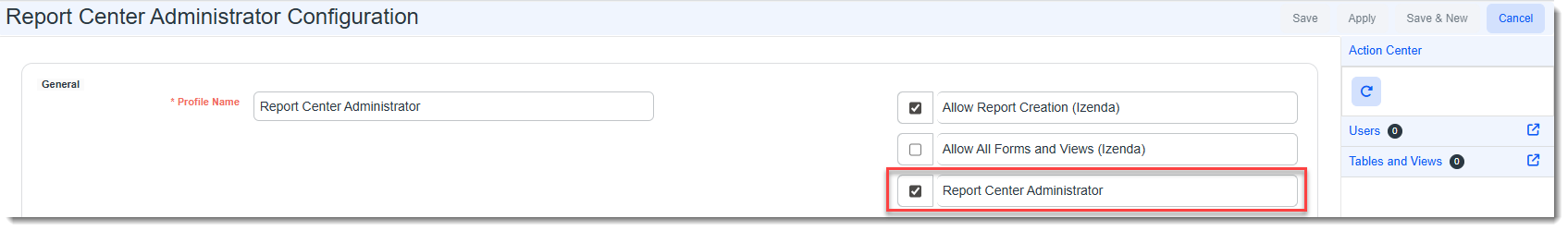 Updated Reporting Profile Configuration to Allow Specifying a Sigma "Report Center Administrator" In preparation for the Business Intelligence model's transition from the Izenda reporting system to the Sigma Report Center reporting system, we have added a new Report Center Administrator profile and a new Report Center Administrator checkbox to the Reporting Profile configuration window (System Admin The Report Center Administrator checkbox is checked by default on the Report Center Administrator profile as shown in the example below: The Report Center Administrator checkbox is unchecked by default on all other pre-existing Reporting Profiles. This gives a user with Developer access the flexibility of assigning Report Center administrator access to an existing profile. Note: The Report Center Administrator field is visible but dimmed and inaccessible (i.e., grayed) if you are not logged in as a Developer user. When Report Center Administrator is checked on a profile, any existing Tables and Views (on the Action Center of the Reporting Profile record) are copied from the existing Administrator Reporting Profile to this profile. Additional changes include: