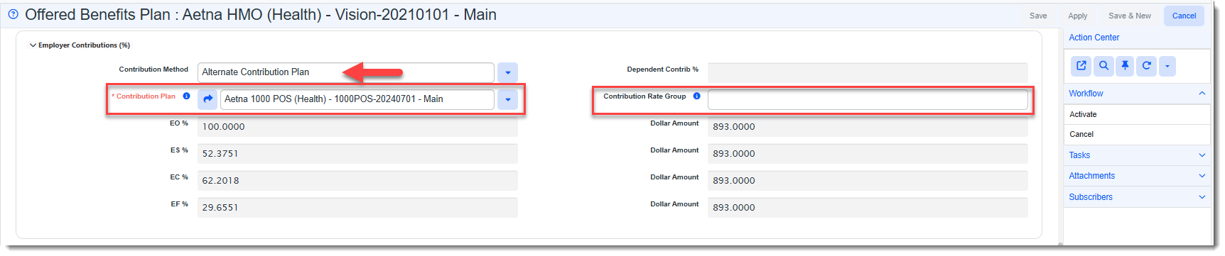 Updated OBP Import "Update Contributions" Logic Previously, when using the OBP Import process to import Offered Benefit Plans (OBPs) from PrismHR, selecting the Update Contributions option resulted in ClientSpace setting the Employer Contributions Contribution Method field to "Manually Set Dollars" and then updating the Dollar Amount field for each coverage level (i.e., EO/EE, ES, EC, EF/FAM, or EK) where a match could be made to a corresponding PrismHR coverage level.