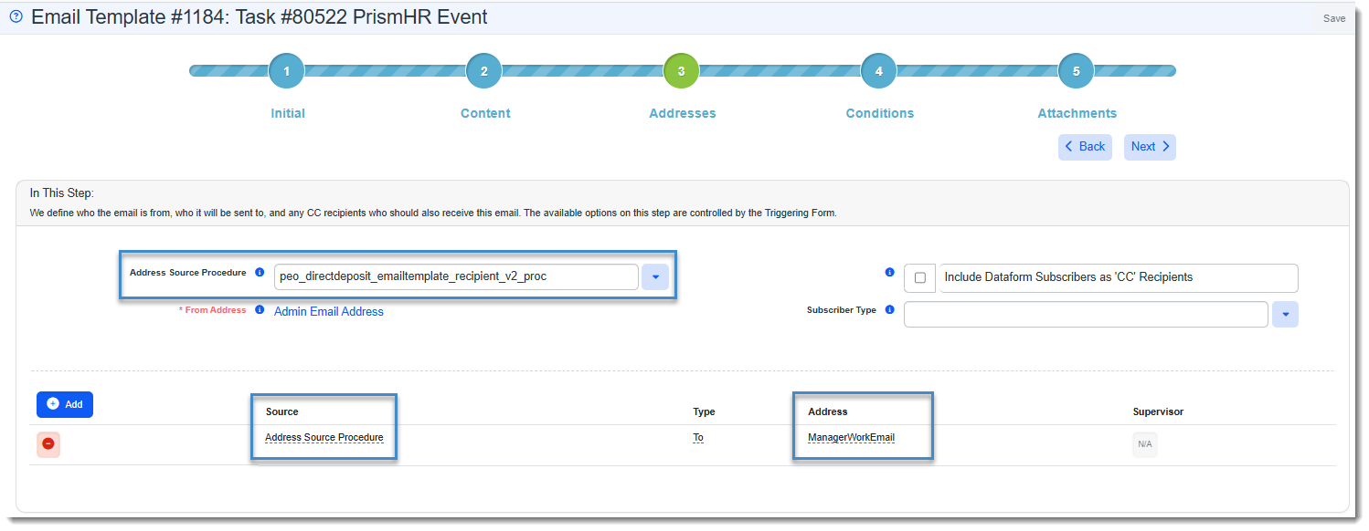 Modified Existing Server Data Procedures to Retrieve Employee Manager Email Address Two new server data procedures have been added to ClientSpace for use on email templates to connect the Manager field on the Employment form to the Manager's email address on the Employee form and facilitate retrieving their email address on email templates triggered by a direct report's Employee record, Employment record or PrismHR Direct Deposit Event record: