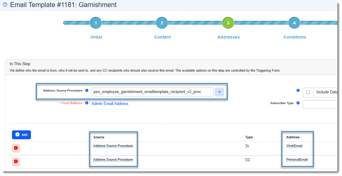 Added Garnishments Server Data Procedures to Retrieve Garnished Employee Name and & Email Addresses Two new server data procedures have been added to ClientSpace to facilitate retrieving the garnished employee's name, work and personal email addresses from the Employee record associated with their Garnishment record(s) for use on email templates: