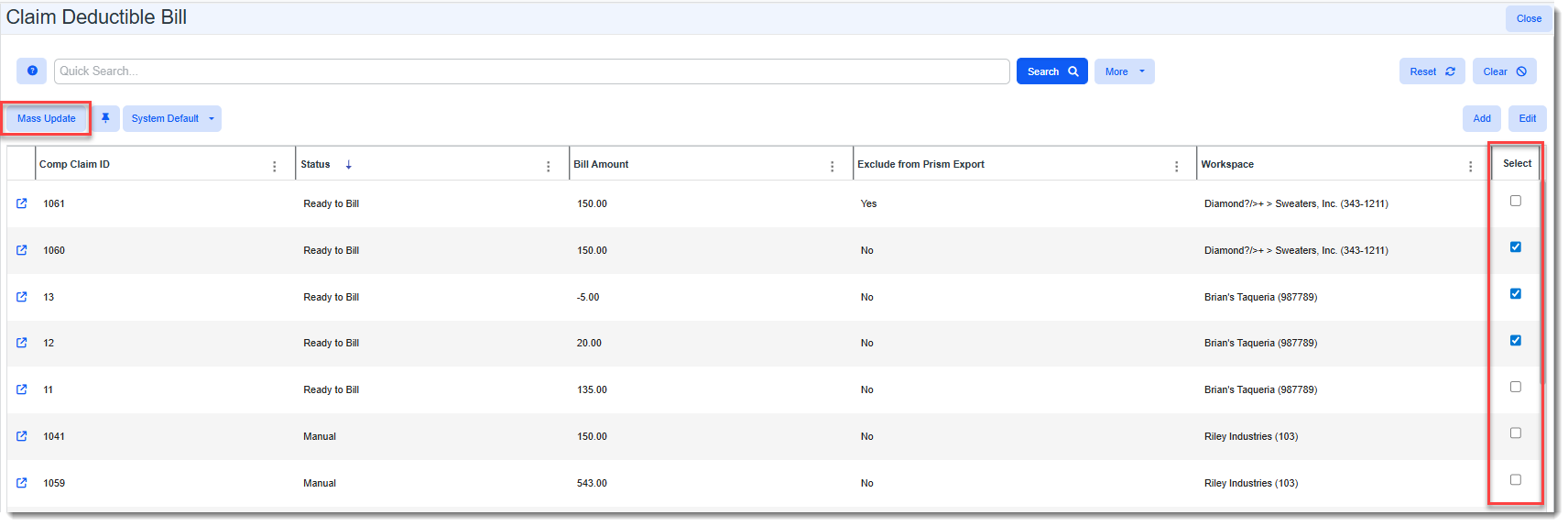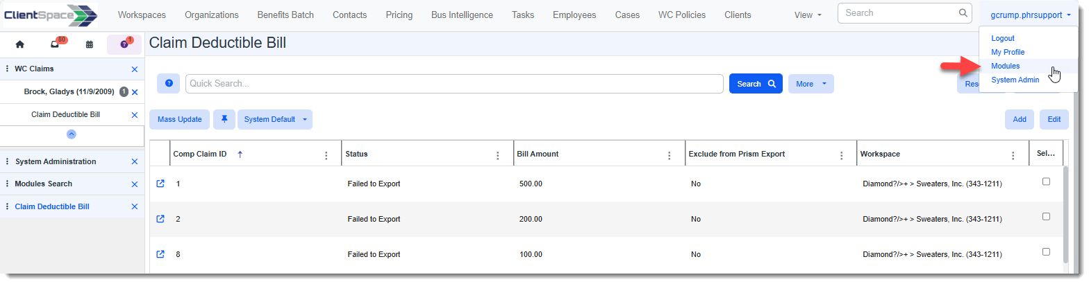 Note: To use the Mass Update option, you must access the Claim Deductible dashboard from the Modules toolbar or from Modules Search (by clicking your username and then selecting Modules in the upper right corner of ClientSpace). If you instead click the Claim Deductible link on a Comp Claim to access the Claim Deductible dashboard, you will not see the Mass Update option. When the Claim Deductible dashboard is accessed from a Comp Claim, it is a filtered version that only shows a list of Claim Deductible bills related to the Comp Claim you are viewing and it does not display the Mass Update feature or the Exclude from Prism Export column. (It does, however, contain the Exclude from Prism Export option in the More search.)