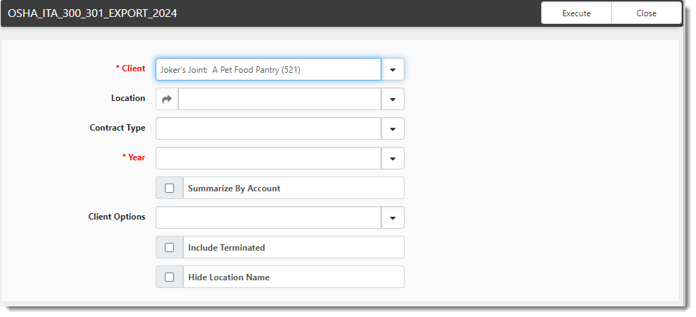 This filter option is a carryover from thorginal version of the OSHA 300 report where you can run the report from the Admin Workspace for multiple clients at once and specify whether you want to include claims from clients across workspaces that have been terminated in the OSHA year selected. This does not apply for the combined OSHA 300/301 merge export as you can only run the report for a specific workstation from the Client Master file of that workstation. You cannot run the report across multiple clients.