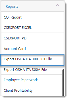 Note: As of Jan. 1, 2024, OSHA requires report submission through their Information Technology Application (ITA) portal. You can generate a merge report from ClientSpace for ITA portal submission. ITA requires a .CSV file format. The merge generates a combined OSHA 300/301 report in .xslx format. You can save the Excel file in the required .csv format prior to submission. To generate an OSHA 300/301 report for ITA submission, refer to the Generating an OSHA 300/301 ITA Export File section of this article.