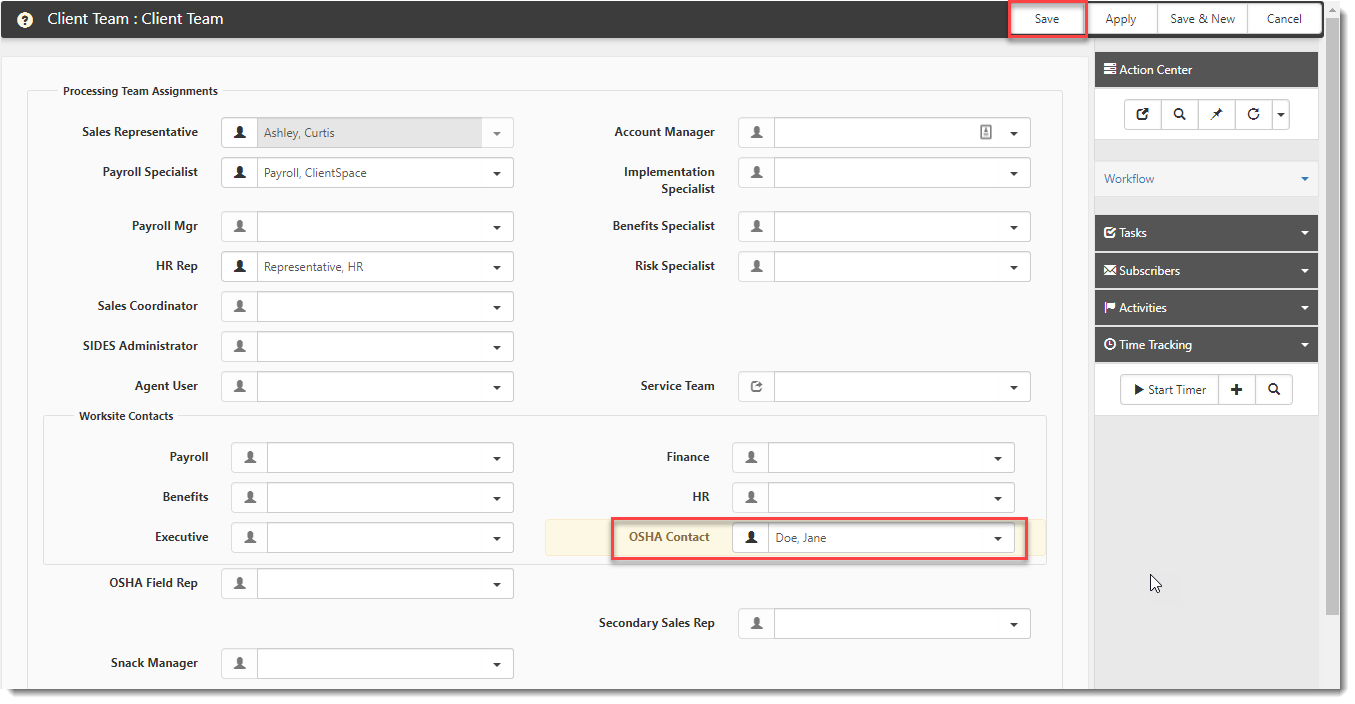 (Open) on the Client Team widget. - Select the OSHA Contact and click Save.