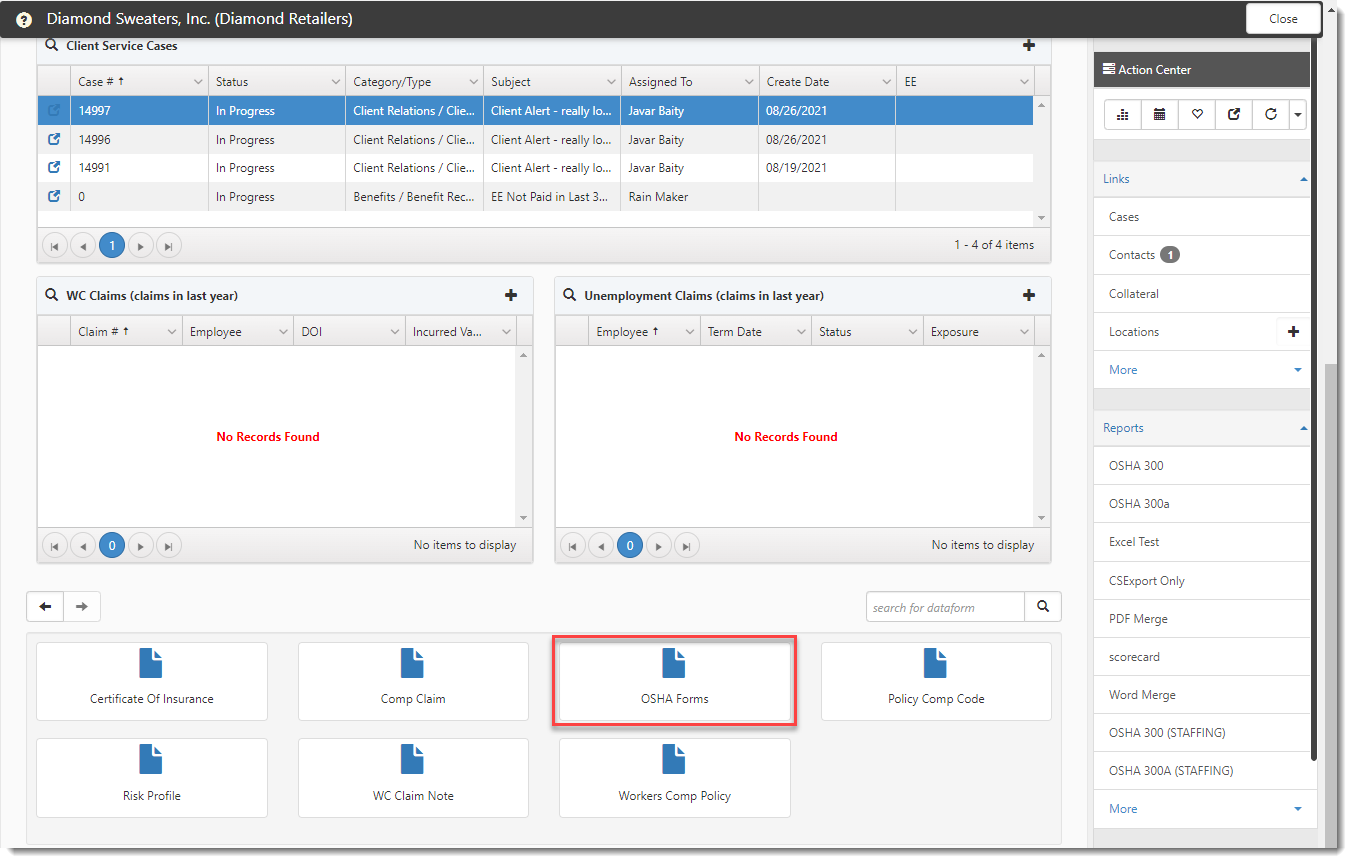Once reports have been generated, access them from each client workspace by opening the OSHA Forms dataform.