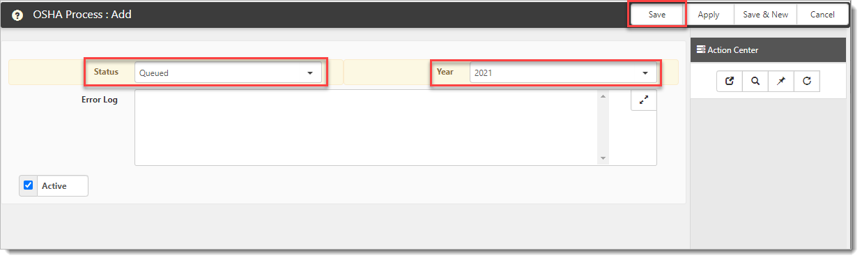 Select a status of "New" if you want to set up OSHA Process records for future years in advance. Just remember to set the status to "Queued" when you are ready to generate the reports.