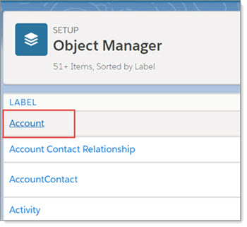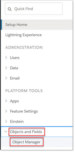 | 3. | In Setup Home, select Objects and Fields > Object Manager. |