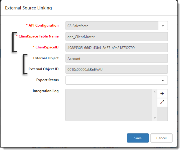When a change is made to a dataform with mapped fields, an audit record is created containing the change. When the Salesforce Scheduled Process (Salesforce Sync Rest API) runs, ClientSpace uses the External Source Linking table (System Admin > Imports > External Source Linking) to determine whether to update or create an object. The External Source Linking dashboard displays a list of all API objects. If you open an External Source Linking record and see entries for both a Clientspace Table Name/ClientSpaceID pair along with an External Object (i.e., Salesforce object)/External Object ID pair, this means that there is already a link between the objects in Salesforce and ClientSpace.