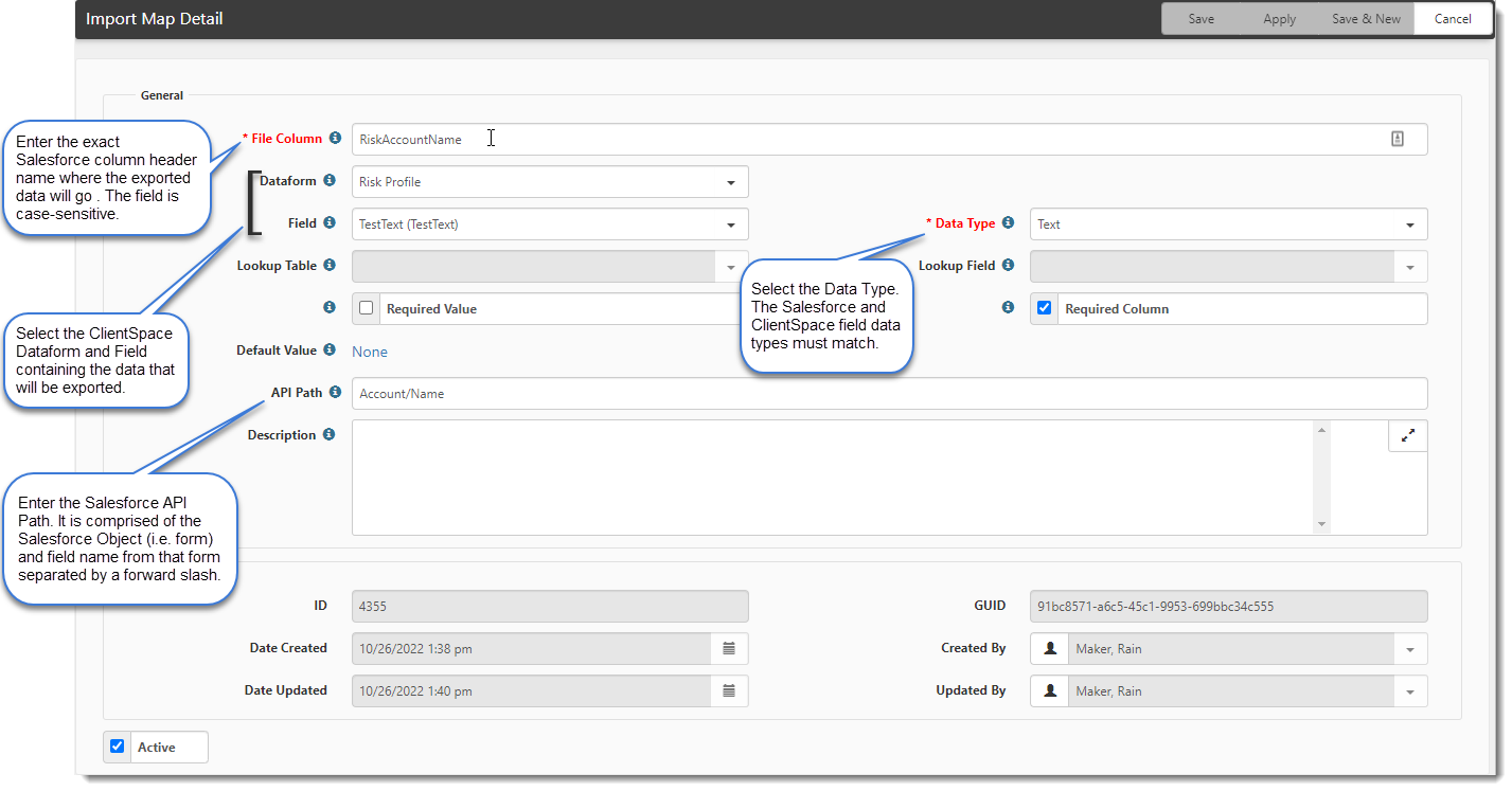 - Open the Salesforce Export API Import Map Header Detail record. (See Step 2 for details.)