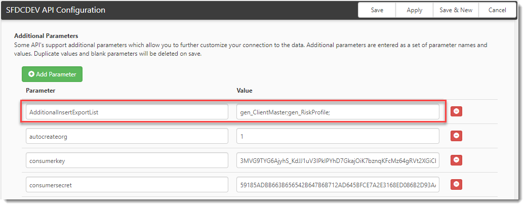 The API Configuration form opens. - Add the Parameter and add the form names (table names) to the Value field as shown below. Separate them by a semicolon if there is more than one.