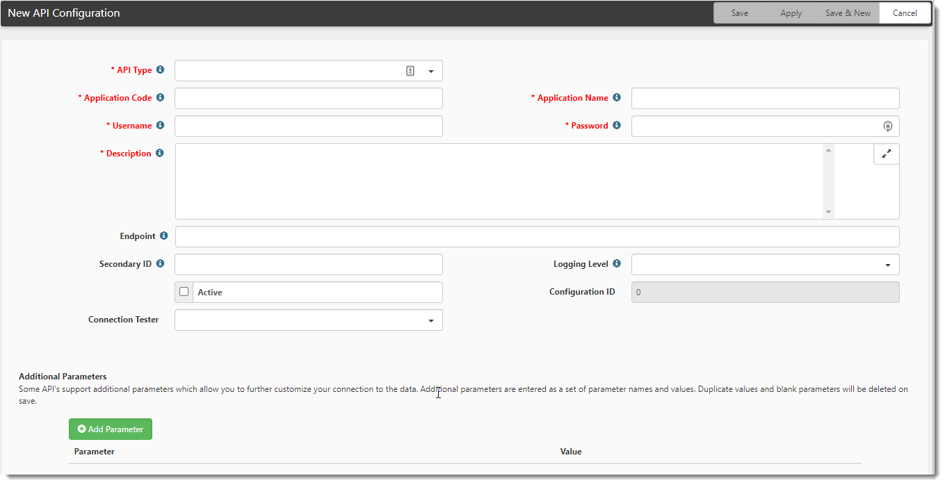 | 4. | Add Additional Parameters. Click Add Parameter to add a new row to the Additional Parameters section if the parameter is not already listed. |