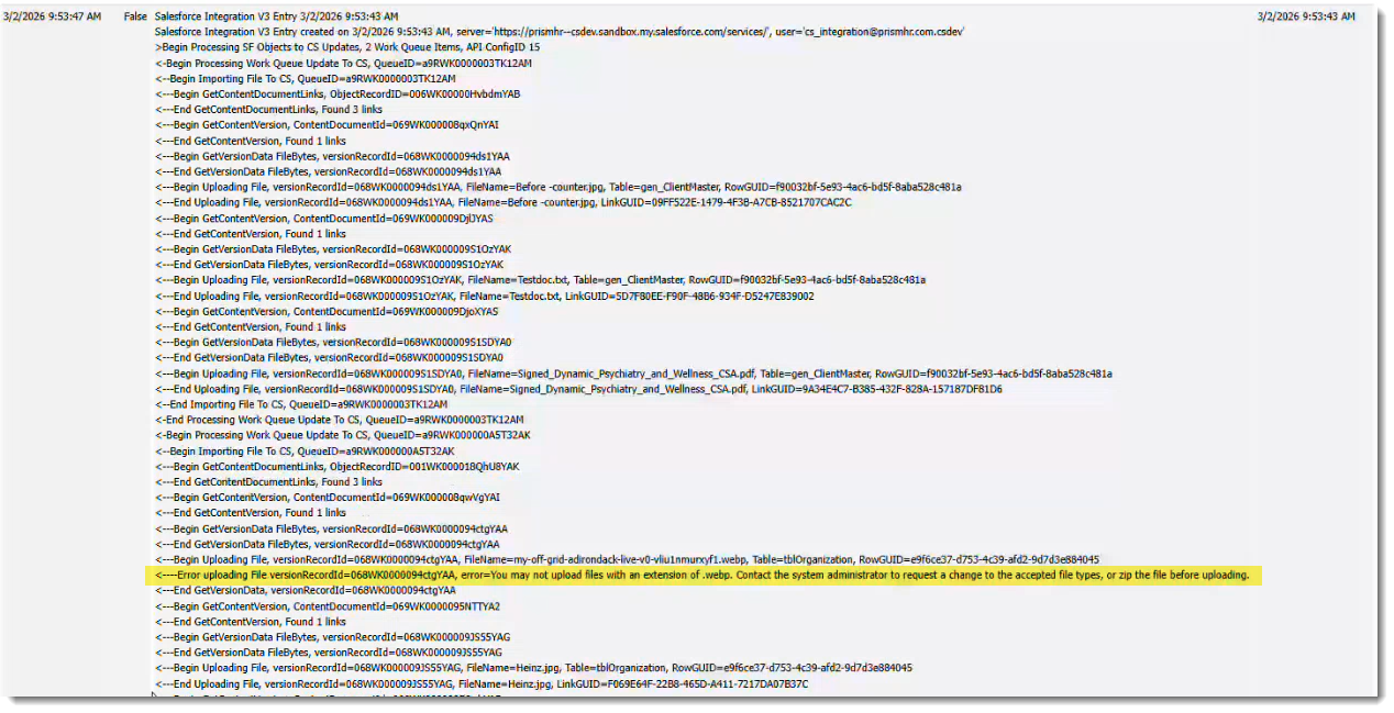 Each file download is also evaluated to ensure its file extension matches a supported file extension in ClientSpace. If it does not, the file download is skipped and an error message similar to the highlighted message below is added to the SFDC API Log report: