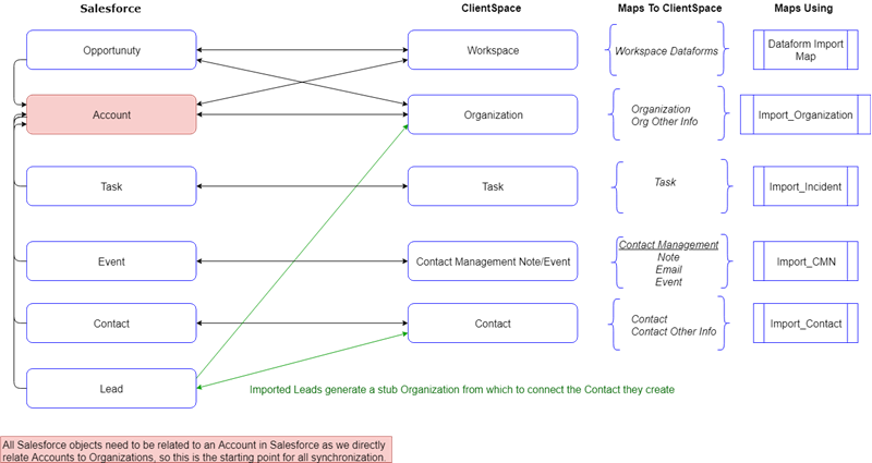 The following diagram shows the relationships between Salesforce and ClientSpace objects. Only one Opportunity can be mapped to ClientSpace per Organization, even though there can be multiple Opportunities associated with an Account. Use the Opportunity RecordType.Name to identify the correct Opportunity (see ClientSpace Configuration section).