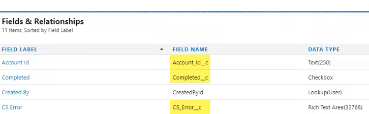 Note: In Salesforce, "_c" is added to the end of the Field Name to indicate that it is a custom field: