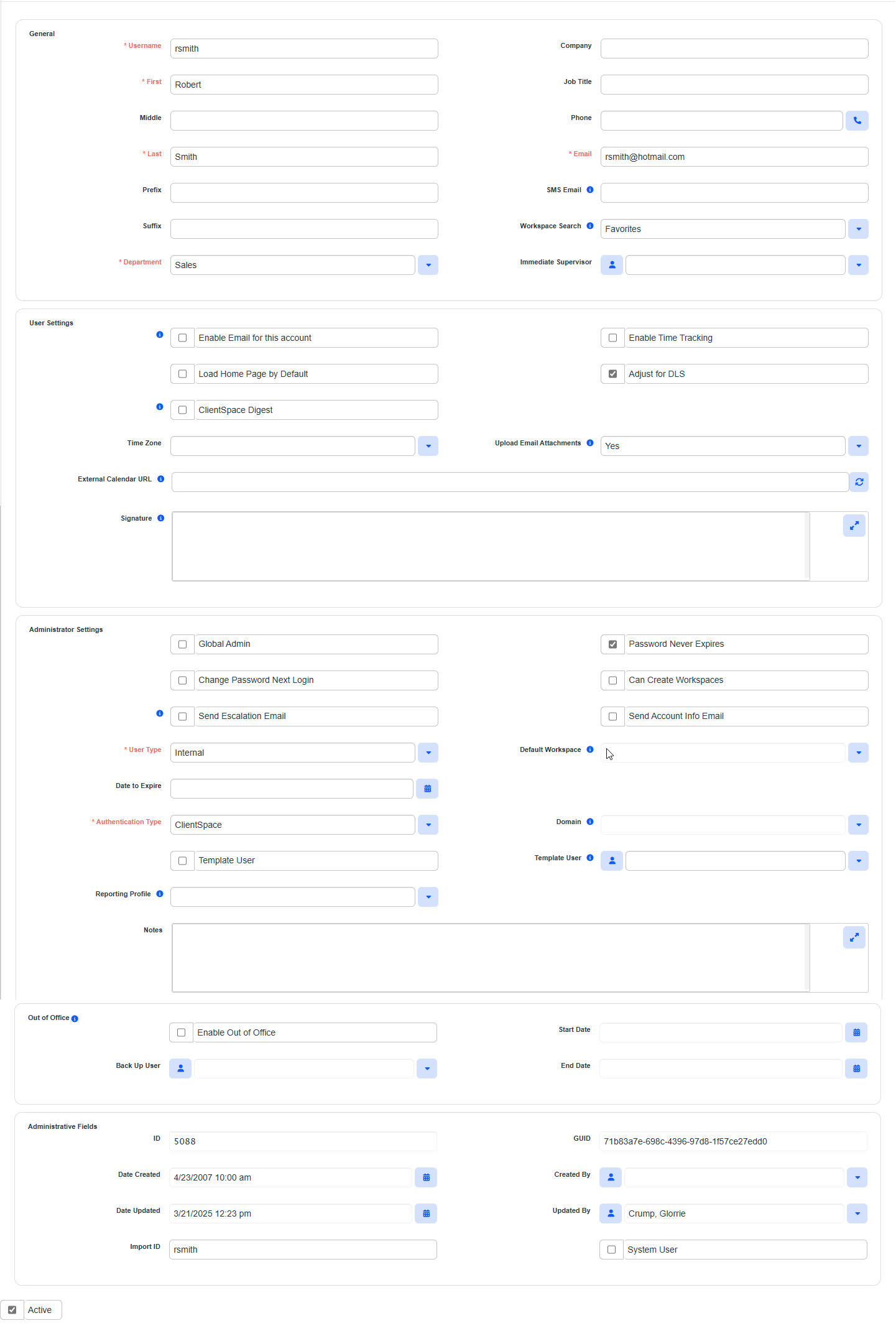 All ClientSpace users have a user profile. For some clients, the user profile automatically imports from PrismHR or Salesforce. And administrators can manually add user profiles. The user profile record contains the username that you use to access ClientSpace, along with a few identification fields, such as Name, Department, Job Title, Phone, and Email. Additionally, the user profile has a few administrative and out of office settings.