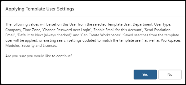 Additionally, saved searches from the template user will be applied, or existing search settings updated to match the template user; as well as Workspaces, Modules, Security and Licenses. Note: If you select a value in the Template User field, the system displays the Applying Template User Change message. Click Yes to continue and use the template user settings for the current user that you are creating or editing. The following graphic illustrates the Applying Template User Change message. |