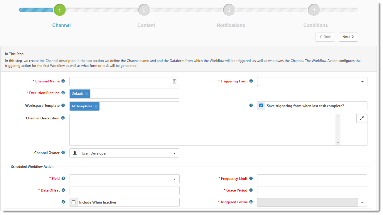 | 3. | When you select Scheduled, the Add Workflow Channel wizard opens with Step 1 Channel. In this step, you need to configure the date that triggers the scheduled Workflow Action. |