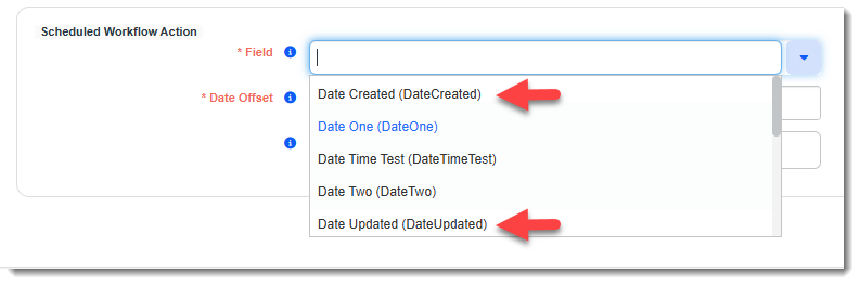Presents a list of available Date fields from the Triggering Form selected. Note: In addition to regular form Date fields, you can also trigger your workflow by the date a Parent or Tabbed dataform was created (Date Created) or updated (Date Updated). |