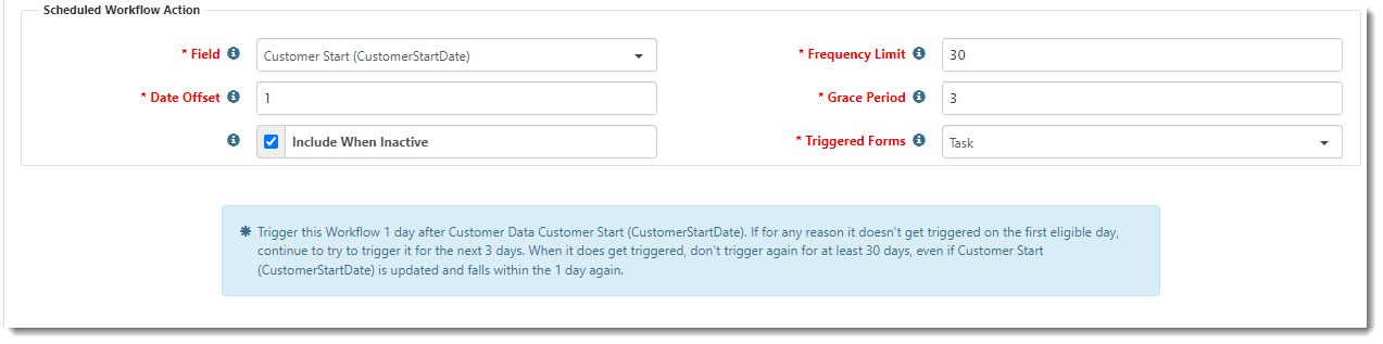 Optional field. When the checkbox is checked, triggering of the scheduled workflow will occur for both active and inactive triggering forms. When the checkbox is unchecked, triggering of the scheduled workflow will only occur for active triggering forms. |