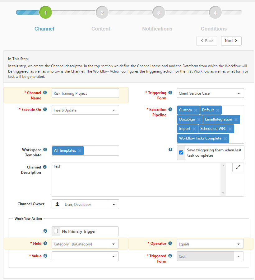 Can be a dataform (with Workflow Cloneable fields) or a task. The selected dataform affects the displayed fields in Step 2 Content. If the Triggered Form field is set to Task, you must select a form in the Attach To field. If the Triggered Form field is no longer cloneable, a warning message displays: Workflow channel cloning is no longer enabled for this triggered form. If you still wish to use this as your triggered form, go to Dataform admin and select the Enable WFC Cloning option. |
