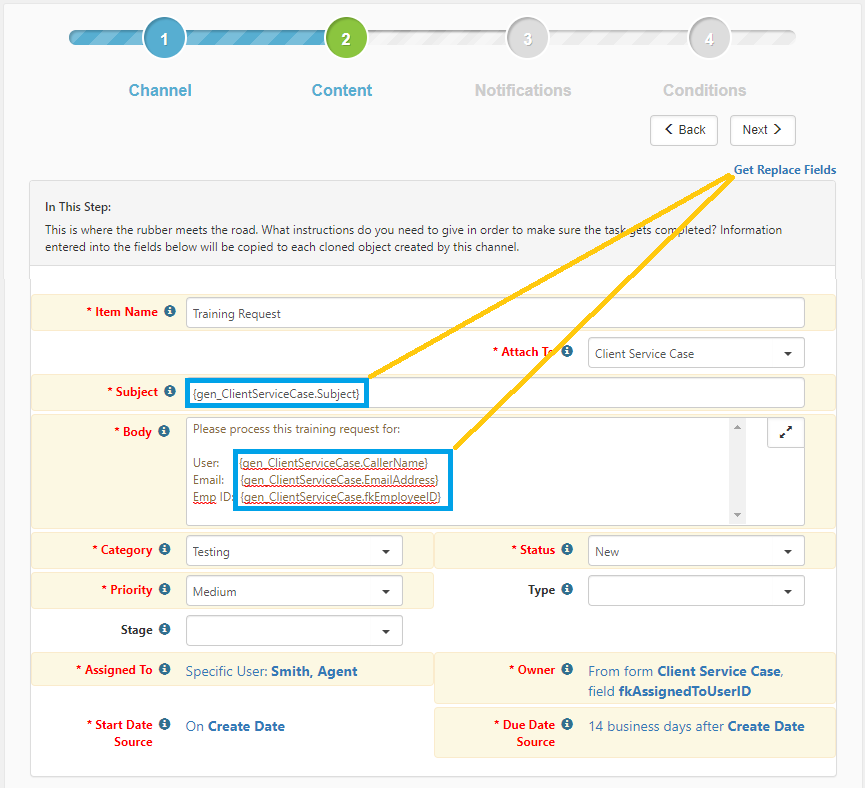 For Email Templates, in the Content step, click See Replace Fields. For Workflow Channels, in the Content step, click Get Replace Fields.