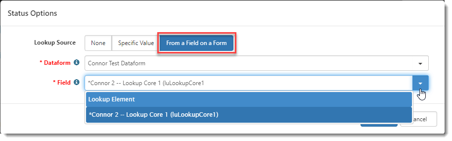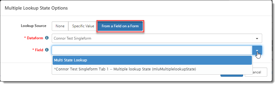 Lookup and Multi-Lookup field names vary by dataform. To display as an available field on a workflow item, a Lookup or Multi-Lookup field must be set as a workflow cloneable field. Note: Multi-Lookup fields work the same as a regular Lookups except that users can pick more than one selection from the list of available options. To configure a lookup field: