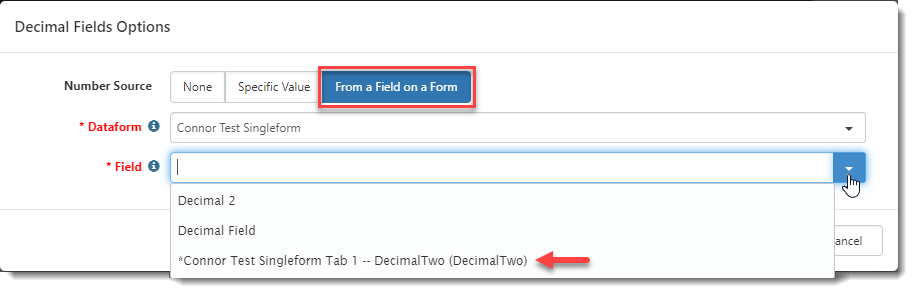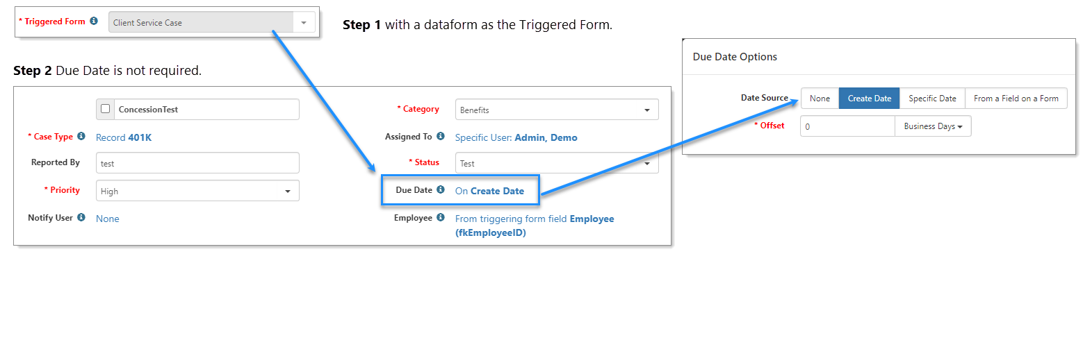 Additionally, date fields can vary. Some dataforms may have Date One and Date Two, and others may have Due Date. On Step 1, when the Triggered Form is a dataform, and the date field is not required, you have the option to set the On Create Date to None.