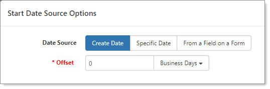 Date Source options are Create Date, Specific Date, and From a Field on a Form. Additionally, you can select the Offset as Days, Weeks, Months, Years, Business Hours, Business Days, Beginning of Month, End of Month, Beginning of Year, or End of Year. For Date/Time fields you have an additional option to set Minutes.