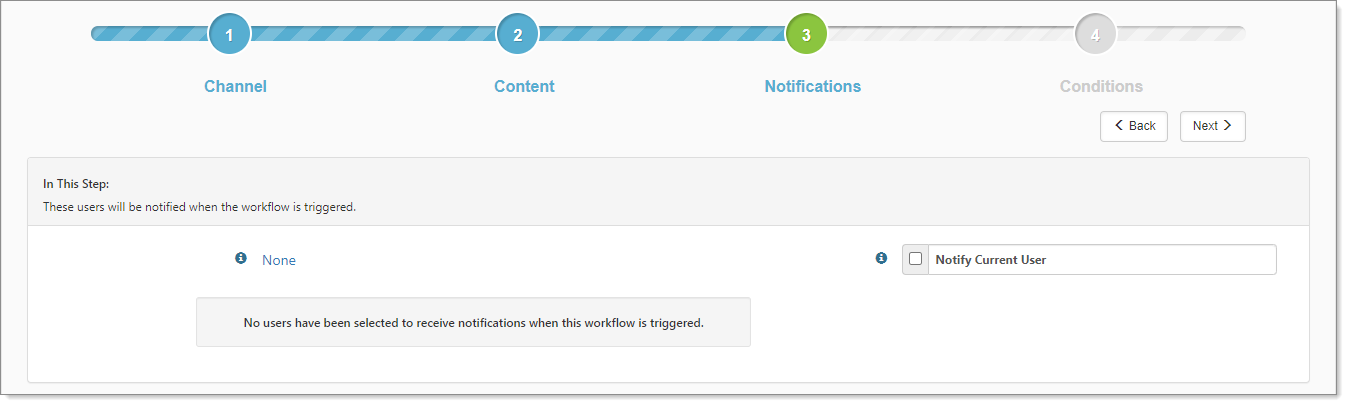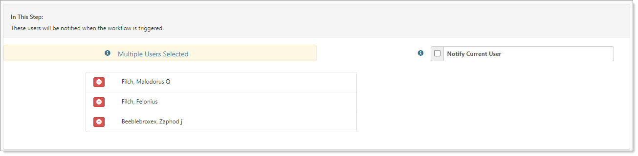 In this optional step, you can select users to notify when the workflow is triggered. You can notify the current user (logged in user) as well as other users.