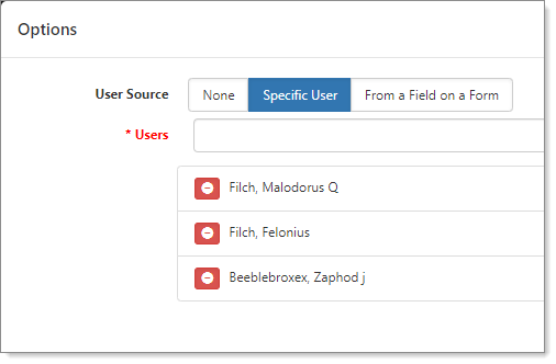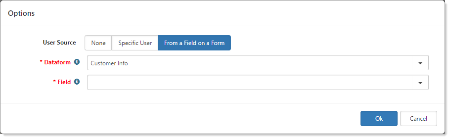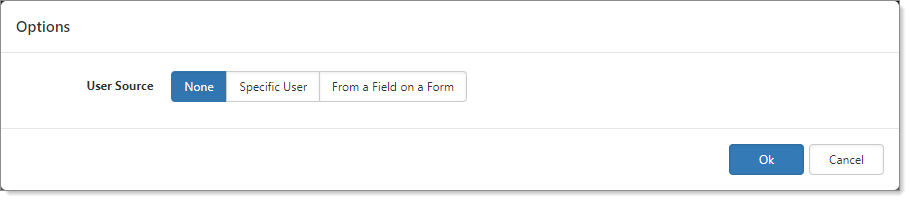 The Options dialog box opens, with User Source options: None, Specific User, and From a Field on a Form.