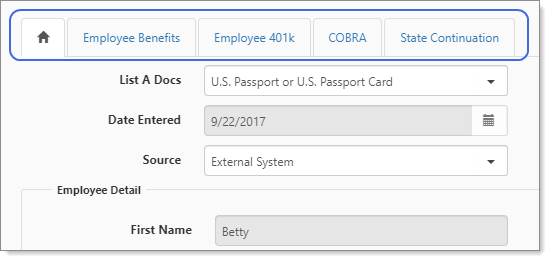 Tabbed dataforms comprise a parent (home form) and child forms, which are extensions of the parent. The following image is an example of the Employee dataform with four tabs: Employee Benefits, Employee 401k, COBRA, and State Continuation. This is a tabbed set of dataforms.