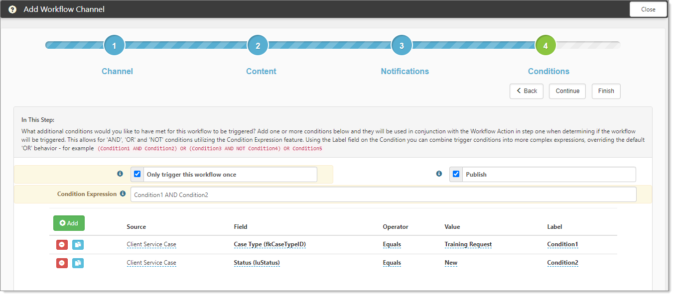 Condition Expressions operators (AND, OR, and NOT) work across multiple dataforms. You can configure conditions for task workflow channel items from the most recent parent dataform if your tasks are multiple levels deep. This enables you to refer back to the child dataform logically. (For example, a milestone triggers a Case, and the Case triggers multiple layers of Tasks, all Tasks can reference the Case).